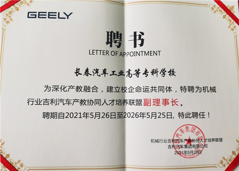 学校被聘为“机械行业吉利汽车产教协同人才培养联盟副理事长单位”