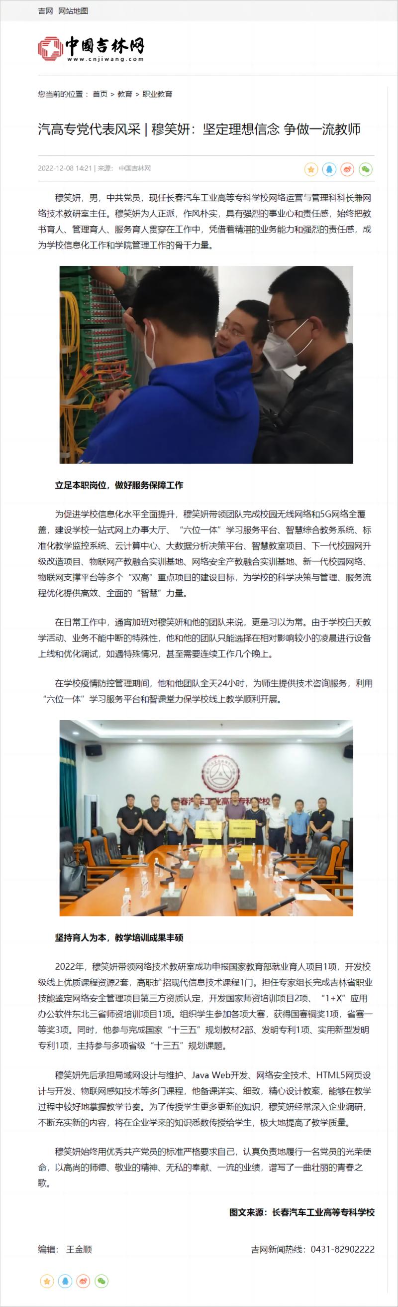 中国吉林网——汽高专党代表风采 | 穆笑妍:坚定理想信念 争做一流教师